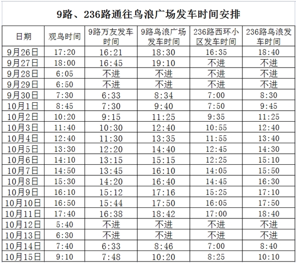為方便市民“國慶”“中秋”節(jié)日期間觀賞自然景觀時順暢出行,營口交運集團適時調(diào)整部分公交線路班次。從9月26日起—10月15日,公交9路、236路分時段區(qū)間延伸至大遼河口鳥浪廣場運營。